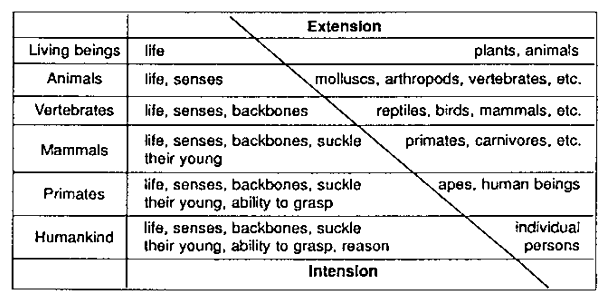 Concepts have two aspects, namely, intension and extension. To explain these, let us take living beings as an example. Living beings can be classified into the concepts of various levels, such as animals, vertebrates, mammals, primates, and human beings. Living beings are those beings that have life. Animals, in addition to life, also have senses. Vertebrates have a backbone. Mammals have the nature of suckling their young. Primates have the ability to grasp things. Human beings have reason. In this way, the living beings of each level, represented by a certain concept, possess a certain common nature. The qualities, or properties, common to a certain concept are called the intension of that concept.