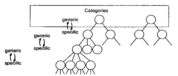When we compare any two concepts, the concept whose intension is broader and extension narrower is called "specific concept" (or subordinate concept), and the concept whose intension is narrower and extention broader is called "generic concept" (or superordinate concept). For example, when we compare the concept of vertebrate with the concept of reptile, the former is a generic concept in relationship to the latter; and the latter is a specific concept in relationship to the former. Also, when we compare the concept of animal with the concept of mollusk, the former is a generic concept, and the latter is a specific concept. If we repeat this operation over and over again, we will eventually reach the highest generic concept, beyond which no other concept can be traced. Such concepts are called "categories" (Fig. 10-2). In addition, the pure concepts that reason has by nature (rather than through experience) are also called categories. These categories vary from philosopher to philosopher. The reason is that the most important fundamental concepts in each thought system are considered categories. Accordingly, the meaning of categories vary from philosopher to philosopher.
