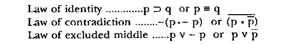 Through the combination of these five basic forms, any complicated deductive inference can be accurately expressed. For example, the basic laws of formal logic, namely, the law of identity, law of contradiction, and law of the excluded middle, can be symbolized as follows: