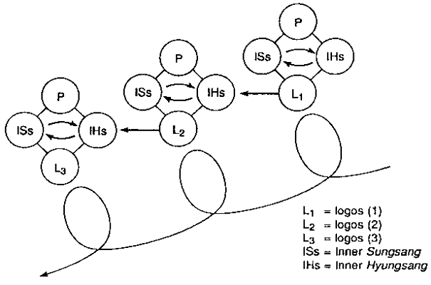 In the stage of reason, how does the four-position base develop? First, through the give-and-receive action between the inner Sungsang and the inner Hyungsang, the logos of the first step, namely, a plan (a multiplied body) is formed as the conclusion of the thinking. This sometimes concludes the process, but in most cases, based upon that conclusion the logos (a plan) of the next step is formed. The logos formed at the first step has been stored in the inner Hyungsang as an idea or a concept and is mobilized as material for the next step of thinking, together with many other materials (ideas, concepts, etc.). In this way, the logos of the second step is formed, which is again stored in the inner Hyungsang to be mobilized in further thinking. Then the third-step logos comes to be formed. Thus, thinking continues endlessly. This is the process of forming the four-position base in the rational stage. It is called the development of thinking in a spiral form (Fig. 10-10).