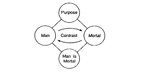 Furthermore, each proposition is composed through the give-and-receive law as well. In the major premise above, we compare man" and "mortality," and we derive the conclusion that "man is mortal." Therefore, here also, a contrast-type give-and-receive action takes place (Fig. 10-12).