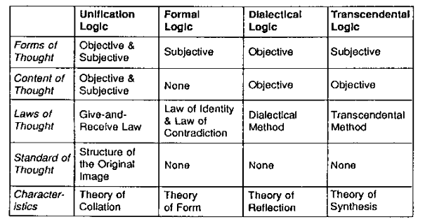 To formal logic itself, Unification Logic has nothing to oppose. That is to say, Unification Logic approves the laws and forms of thought dealt with in formal logic just as they are. Nevertheless, human thinking has not only the aspect of form, but also the aspect of content. Also, thinking has purpose, direction, and relations with other areas (areas of cognition, dominion, ontology). That is to say, thinking is not for the sake of thinking itself, but rather for the sake of cognition and practice (dominion), and for the sake of actualizing the purpose of creation. That is, the laws of thought are merely conditions for thinking to take place.