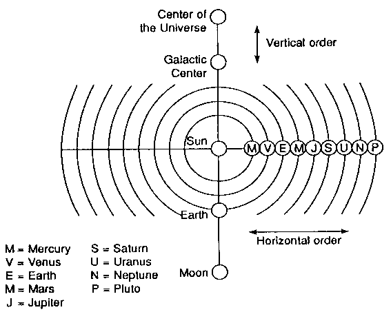 Let us now consider the horizontal order of the universe. If we look at the nine planets of the solar system, we can see that they form an orderly, horizontal arrangement of Mercury, Venus, Earth, Mars, Jupiter, Saturn, Uranus, Neptune, and Pluto. This planetary system, centering on the Sun, is an example of horizontal order in the universe. The vertical order and the horizontal order of the universe are illustrated in Fig. 2-8.