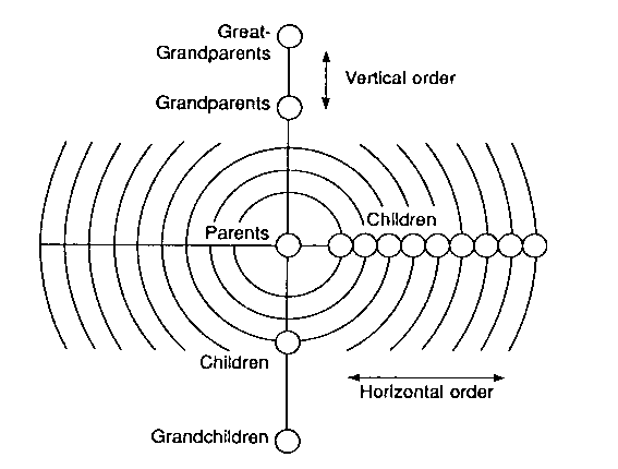 The human family, in its original form, should also have had an orderly system like that of the universe. In the family, there is vertical order, which consists of grandchildren, children, parents, grandparents, and so on; and there is horizontal order, which consists of brothers and sisters centered on the parents. The vertical order and the horizontal order of the family are illustrated in Fig. 2-9.