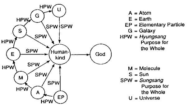 Within the purpose for the whole, there are two types of purposes, namely the "Sungsang purpose for the whole" and the "Hyungsang purpose of the whole." For example, the earth has the purpose of forming the solar system, and at the same time it has the purpose of serving as the dwelling place for human beings. In the case of electrons, they revolve around the atomic nucleus in order to form an atom, and also they do so for human beings by forming all things, which exist for the sake of human beings, since things are objects of human dominion. Thus, each level of created beings from elementary particles to the universe itself -- exists both for the purpose of being part of a higher level being and, at the same time, for the sake of humankind. The former purpose is called the "Hyungsang purpose for the whole," and the latter purpose is called the "Sungsang purpose for the whole" (Fig. 2-4).
