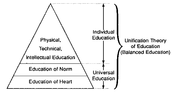 Up to now there have been many kinds of education, each with its own image of the ideal person corresponding to its own idea of education. The Unification Theory of Education must also have an image of the ideal person. The image of the ideal educated person in the Unification Theory of Education is as follows: first of all, a person of' character; second, a good citizen; and third, a genius. These are the images of ideal man and woman corresponding, respectively, to the Education of Heart, Education of Norm, and Education of Dominion. Therefore, when education is seen in terms of the image of the ideal person, the Education of Heart may be called education to develop a person of character, the Education of Norm may be called education to develop a good citizen, and the Education of Dominion may be called education to develop a genius.
